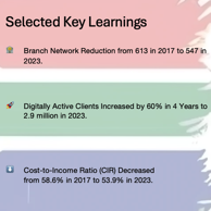 Overall, digital transactions across all channels were up 12% year over year and 98% since 2019. The increased use of digital channels has allowed Nedbank to reduce its reliance on traditional brick-and-mortar branches. The bank has reduced its branch network from 613 branches in 2017 to 547 branches in 2023. This has resulted in cost savings, which have been partially offset by investments in technology and skills development.