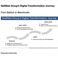 NatWest Group’s transformation between 2019 and 2025 illustrates how a legacy bank can move from state dependency to digital leadership. In 2019, the bank was still majority-owned by the UK government and constrained by high technical debt. Most technology spending was absorbed by legacy maintenance rather than innovation. The COVID-19 crisis in 2020 further delayed modernization and resulted in a significant financial loss. A strategic inflection point emerged in 2021 with the launch of a multi-year investment program aimed at rebuilding the core technology stack. This transition required enduring a costly interim phase in which old and new systems ran in parallel. Despite governance challenges and public scrutiny, the bank maintained operational stability. By 2024, digital investment overtook legacy spend, signaling a structural shift. Full privatization in 2025 marked the completion of both financial and technological recovery.